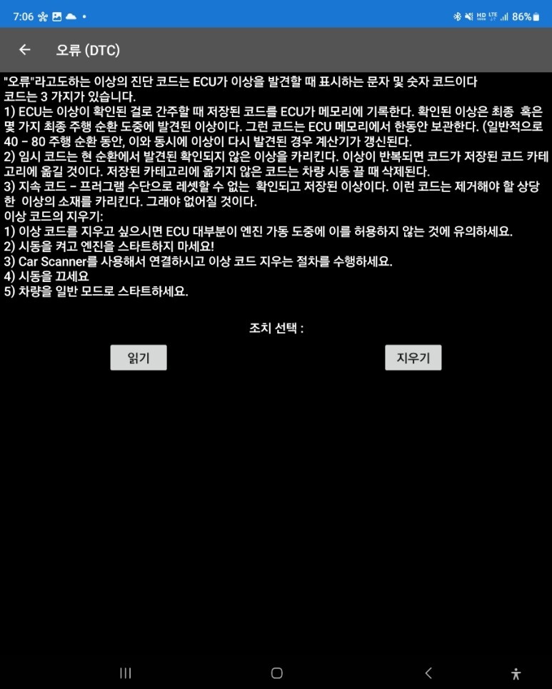 '읽기' 버튼을 클릭하여 오류코드를 확인할 수 있다.