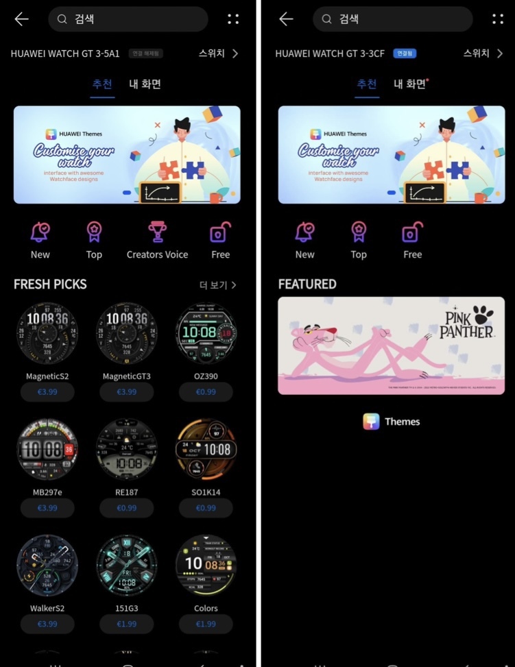 좌 : GT3 42mm 연결했을 때 워치페이스 다운로드 화면