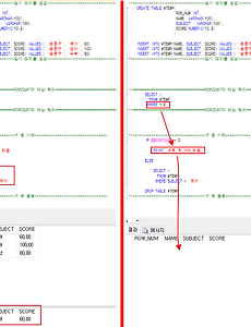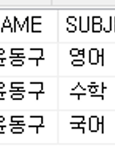 --***********************************임시 테이블 생성***********************************CREATE TABLE #TEMP( ROW_NUM INT, NAME VARCHAR(100), SUBJECT VARCHAR(100), SCORE NUMERIC(10,2) ) INSERT INTO #TEMP(NAME, SUBJECT, SCORE) VALUES ( '윤동구', '국어', 60)INSERT INTO #TEMP(NAME, SUBJECT, SCORE) VALUES ( '윤동구', '영어', 100)INSERT INTO #TEMP(NAME, SUBJECT, SCORE) VALUES ( '윤동구', '수학', 80)--***********************..